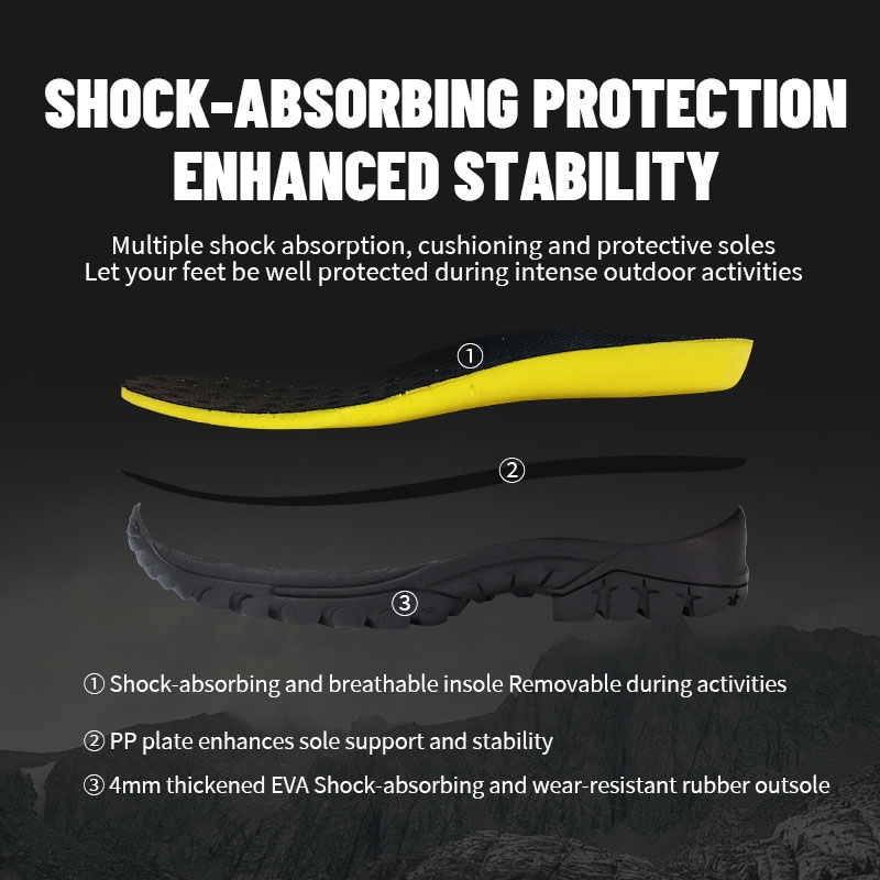 ① تکیے والا، سانس لینے کے قابل insole — جب آپ کو اسے صاف کرنے یا تبدیل کرنے کی ضرورت ہو تو اسے ہٹایا جا سکتا ہے۔ ②پاؤں کے نیچے کی اضافی مدد کے لیے PP پلیٹ کے ساتھ مضبوط بنایا گیا ہے — اس لیے ہر قدم ٹھوس اور کنٹرول محسوس ہوتا ہے۔ ③4 ملی میٹر موٹا ایوا جھٹکا جذب کرنے والا اور پہننے سے بچنے والا ربڑ آؤٹ سول۔