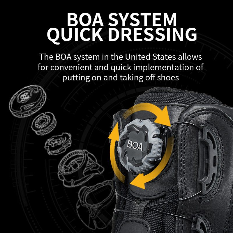 BOA سسٹم آسانی سے آن/آف کرتا ہے: سخت کرنے کے لیے ایک تیز موڑ، ریلیز کے لیے ایک پل۔ کوئی لیس، کوئی پریشانی نہیں۔